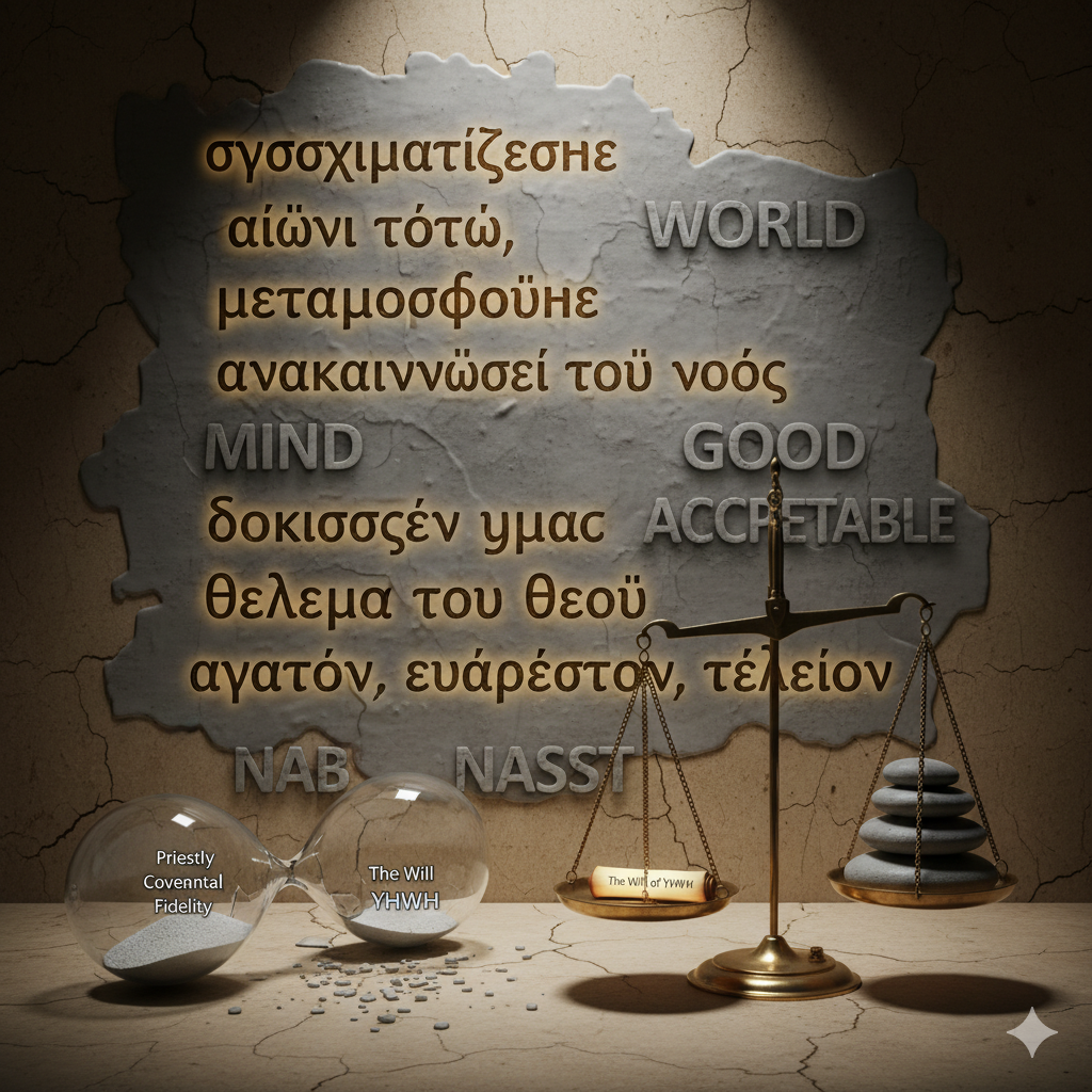 The BDAG parsing introduces a series of institutional glosses that flatten the covenantal voice. συσχηματίζεσθε becomes “to conform to a pattern or standard,” removing the dimensional schema. αἰών is rendered as “world system,” erasing the temporal alert. μεταμορφοῦσθε is glossed as “to change in outward form,” reducing internal metamorphosis to external modification. ἀνακαίνωσις becomes “renewal, renovation,” suggesting psychological therapy. νοῦς is defined as “mind, faculty of understanding,” stripping away relational discernment. δοκιμάζω is parsed as “to examine, approve, test,” shifting from priestly audit to doctrinal approval. θέλημα is rendered as “will, desire,” abstracting covenantal intent. The adjectives agathos, euarestos, and teleios are glossed as “good, acceptable, perfect,” institutionalizing relational attributes into moral categories.
