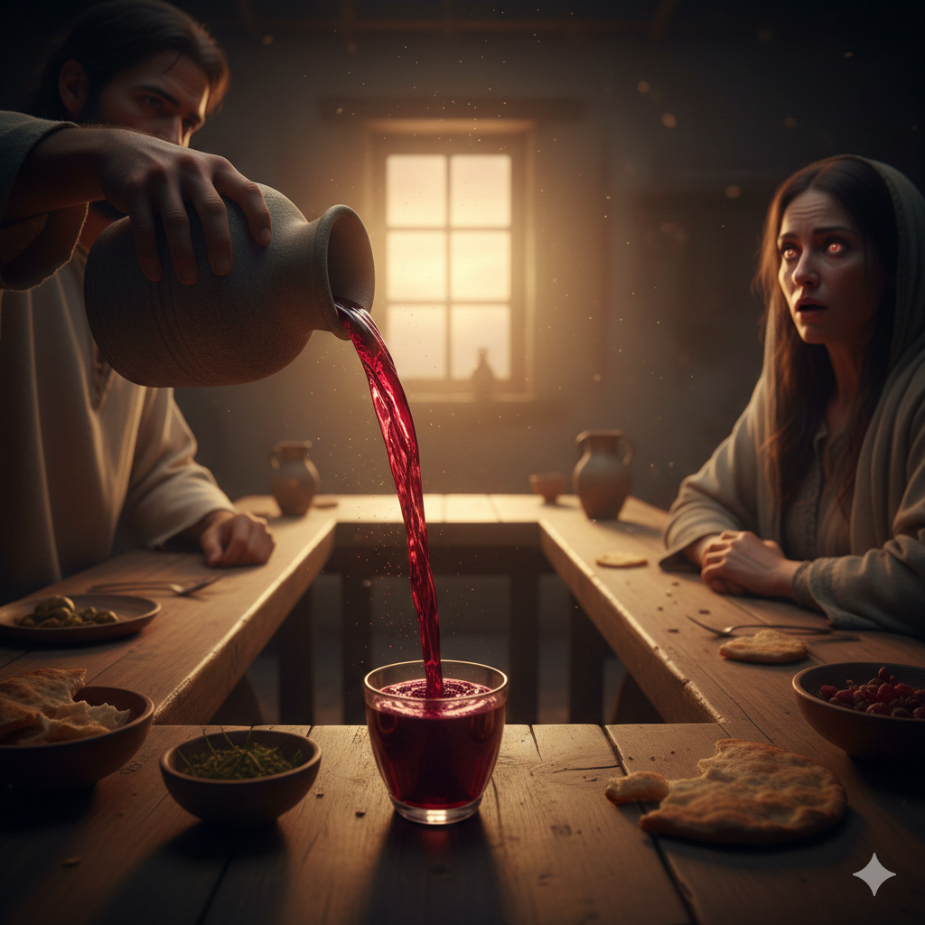 The command to fill the vessels, ὑδρία – hydria (hoo-dree-ah) – “water-pot/vessel,” represents the preparation of the human container for the divine infusion. When the observer witnesses the collapse of potential into the manifestation of wine, their entire demeanor changes. The wine serves as a sign, σημεῖον – sēmeion (say-may-on) – “a distinguishing mark/token,” which points to the reality of the Source. The intoxication described is not a loss of control, but a gain of proximity. The observer moves from the bland distance of skepticism to the intoxicated state of restoration and observation, where they feel the “weight,” the δόξα – doxa (dox-ah) – “glory/brightness/weight,” of the presence of the Father. This is not a party trick; it is the manifestation of the Glory itself. The intrigue of the observer becomes automatic because the demonstration carries its own seductive weight. It reads the observer, pulling them into a state of reception where their lack,need, or dignity is restored through the filling of their void. In this state of superposition, the Indwelt is both the observer of the miracle and the conduit for it, acting as the bridge between the unseen potential and the visible reality.