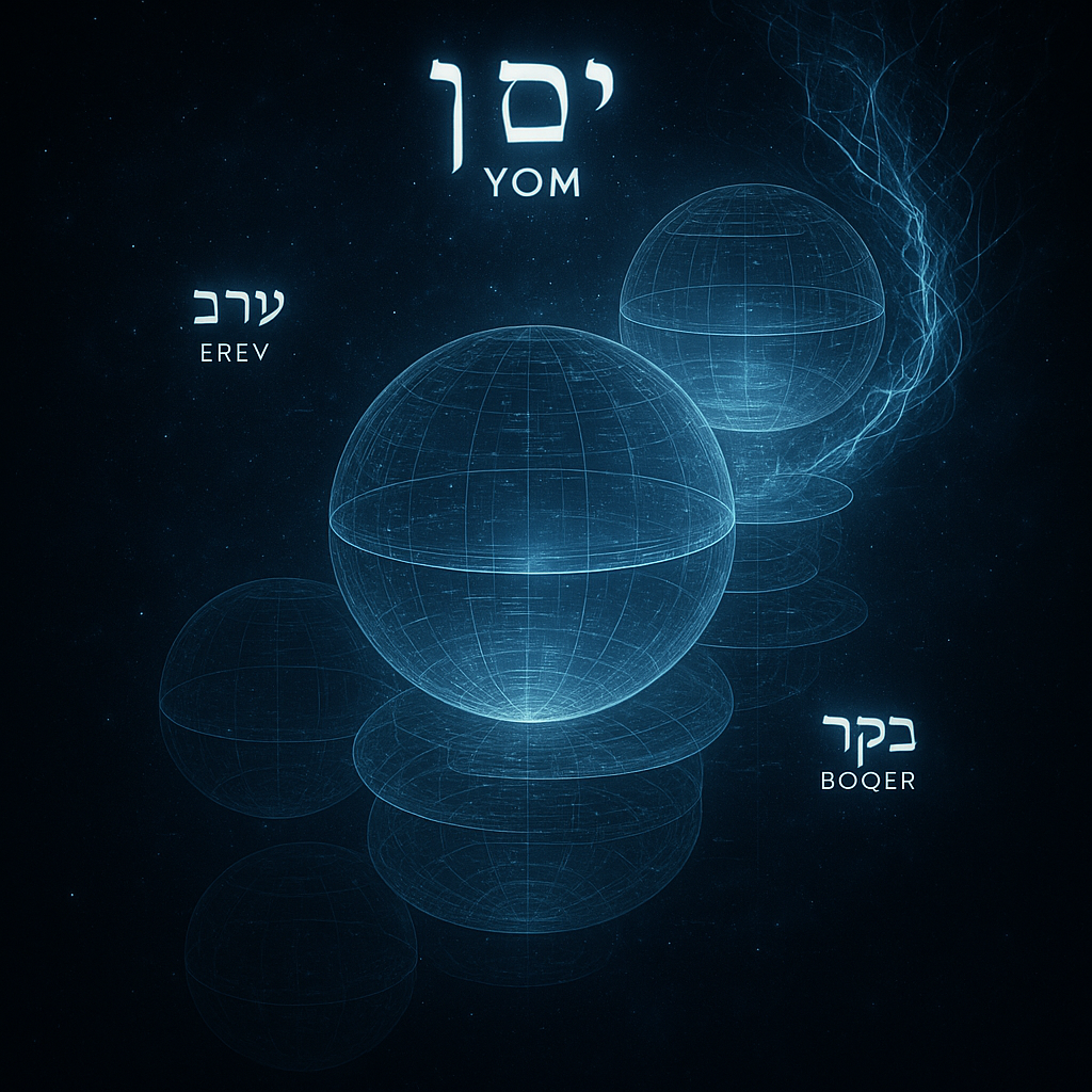 The Hebrew word translated “day” in Genesis 1 is yom. In English, “day” is almost exclusively tied to the sun’s rising and setting, which reduces it to a fixed mechanical cycle of hours. In Hebrew, yom has a far broader, multidimensional meaning. It can refer to the daylight portion of a solar day, a full day from evening to evening, or any defined period of activity—whether hours, years, or an undefined span. Its usage is determined by context. When we break yom apart in its original form, its meaning opens even further. The letters are yod (10), vav (6), and mem sofit (40). Numerically, these speak of divine action (10) binding together heaven and earth (6) and bringing creation through a transitional period (40) into its completed form. In pictograph form, the yod is a hand, the vav is a nail or peg, and the mem is water. Together they form the image of God’s own hand securing and stabilizing what was once formless and chaotic, ordering it into life-giving structure. When these layers are fused, yom is revealed to be a divinely initiated phase in which God actively joins the elements of creation, transforming them from disorder into order, and securing them in their intended function. This is not a description of a clock; it is the description of a stage of construction in the cosmic blueprint.